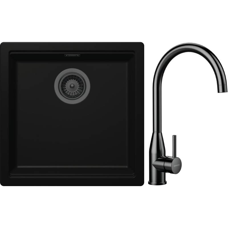 Cenově zvýhodněný set dřezu a baterie Schock S31-5 - obsahuje granitový jednodřez Kiruna N-100 Night, baterii Kavus Gunmetal brushed a části dřezu v provedení Gunmetal brushed.