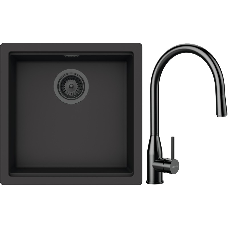 Cenově zvýhodněný set dřezu a baterie Schock S31-10 - obsahuje granitový jednodřez Kiruna N-100 Dusk, baterii s vytahovací koncovkou Kavus.120 Gunmetal brushed a části dřezu v provedení Gunmetal brushed.