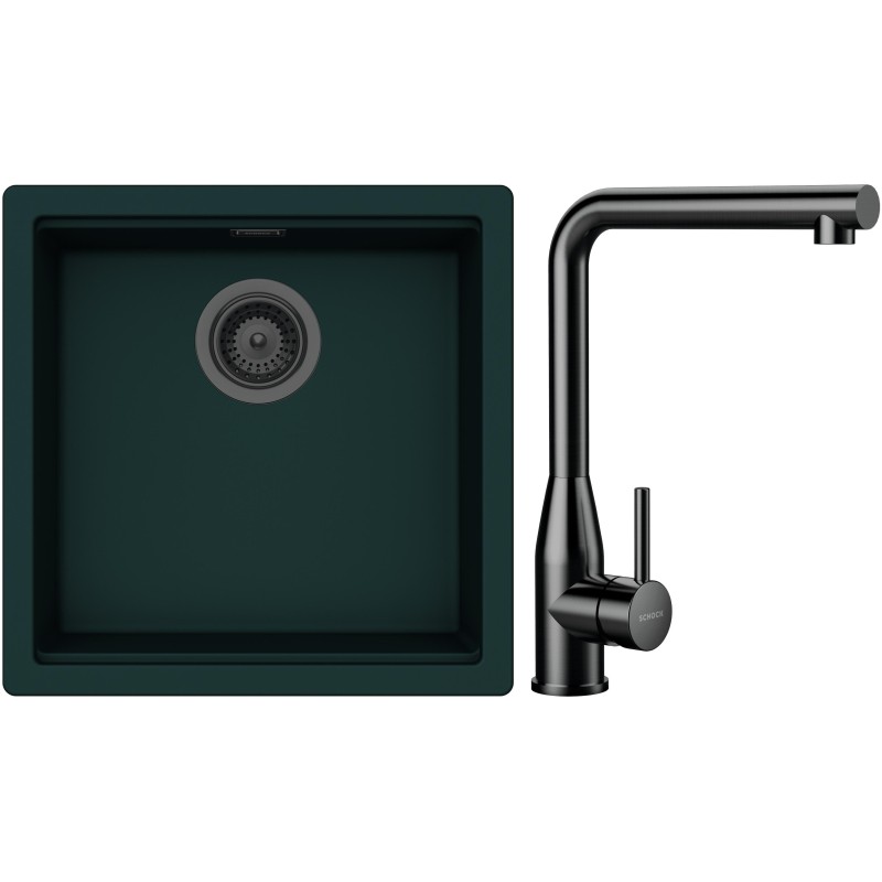 Cenově zvýhodněný set dřezu a baterie Schock S31-15 - obsahuje granitový jednodřez Kiruna N-100 Ivy, baterii Keto Gunmetal brushed a části dřezu v provedení Gunmetal brushed.