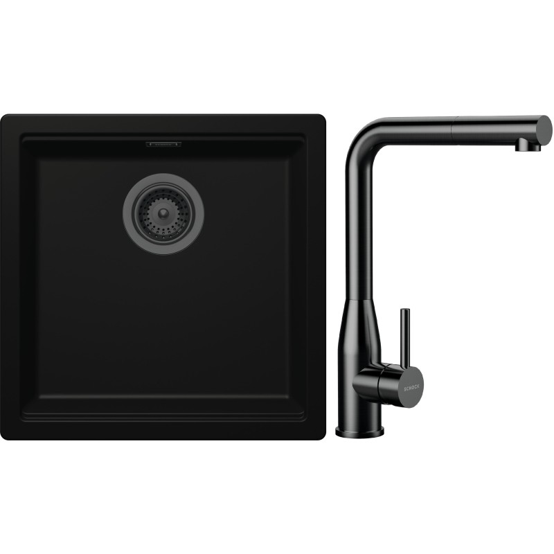 Cenově zvýhodněný set dřezu a baterie Schock S31-20 - obsahuje granitový jednodřez Kiruna N-100 Night, baterii s vytahovací koncovkou Keto.120 Gunmetal brushed a části dřezu v provedení Gunmetal brushed.
