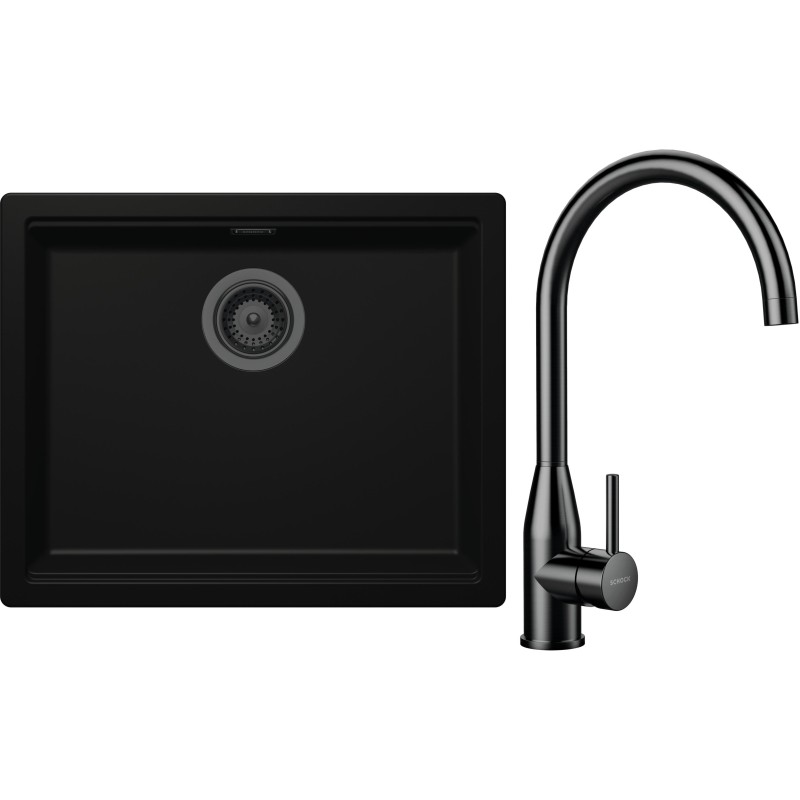 Cenově zvýhodněný set dřezu a baterie Schock S32-5 - obsahuje granitový jednodřez Kiruna N-100L Night, baterii Kavus Gunmetal brushed a části dřezu v provedení Gunmetal brushed.