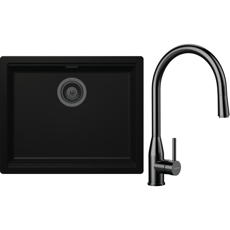 Cenově zvýhodněný set dřezu a baterie Schock S32-10 - obsahuje granitový jednodřez Kiruna N-100L Night, baterii s vytahovací koncovkou Kavus.120 Gunmetal brushed a části dřezu v provedení Gunmetal brushed.