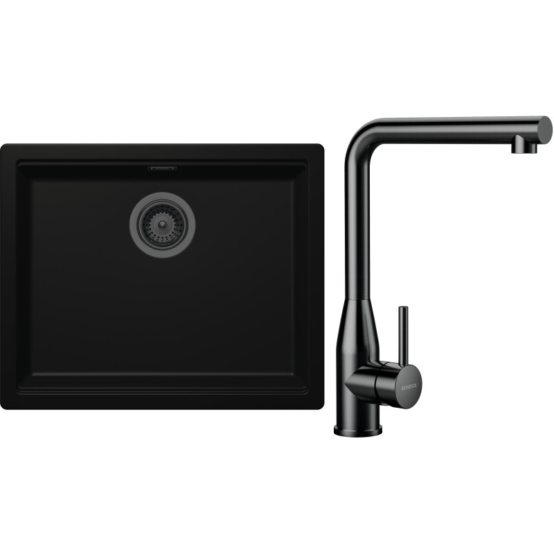 Cenově zvýhodněný set dřezu a baterie Schock S32-15 - obsahuje granitový jednodřez Kiruna N-100L Night, baterii Keto Gunmetal brushed a části dřezu v provedení Gunmetal brushed.