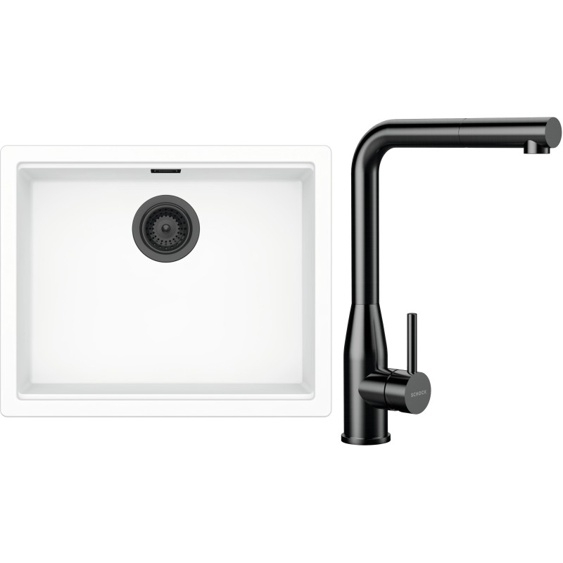 Cenově zvýhodněný set dřezu a baterie Schock S32-20 - obsahuje granitový jednodřez Kiruna N-100L Day, baterii s vytahovací koncovkou Keto.120 Gunmetal brushed a části dřezu v provedení Gunmetal brushed.