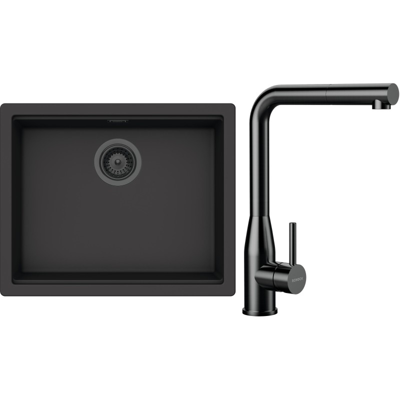 Cenově zvýhodněný set dřezu a baterie Schock S32-20 - obsahuje granitový jednodřez Kiruna N-100L Dusk, baterii s vytahovací koncovkou Keto.120 Gunmetal brushed a části dřezu v provedení Gunmetal brushed.