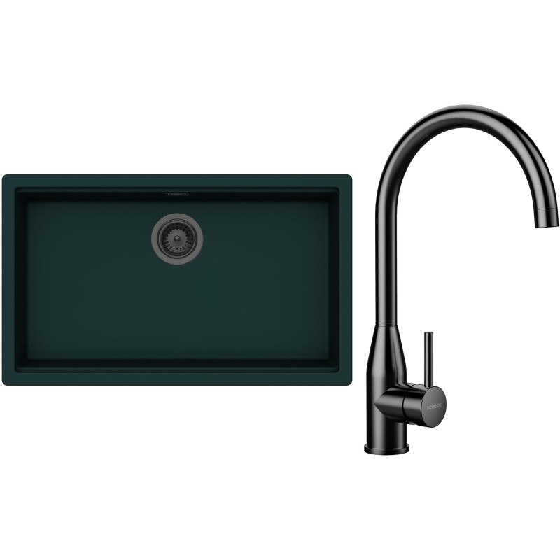 Cenově zvýhodněný set dřezu a baterie Schock S33-5 - obsahuje granitový jednodřez Kiruna N-100XL Ivy, baterii Kavus Gunmetal brushed a části dřezu v provedení Gunmetal brushed.