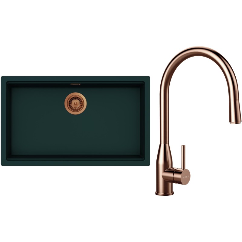 Cenově zvýhodněný set dřezu a baterie Schock S33-9 - obsahuje granitový jednodřez Kiruna N-100XL Ivy, baterii s vytahovací koncovkou Kavus.120 Copper brushed a části dřezu v provedení Copper brushed.