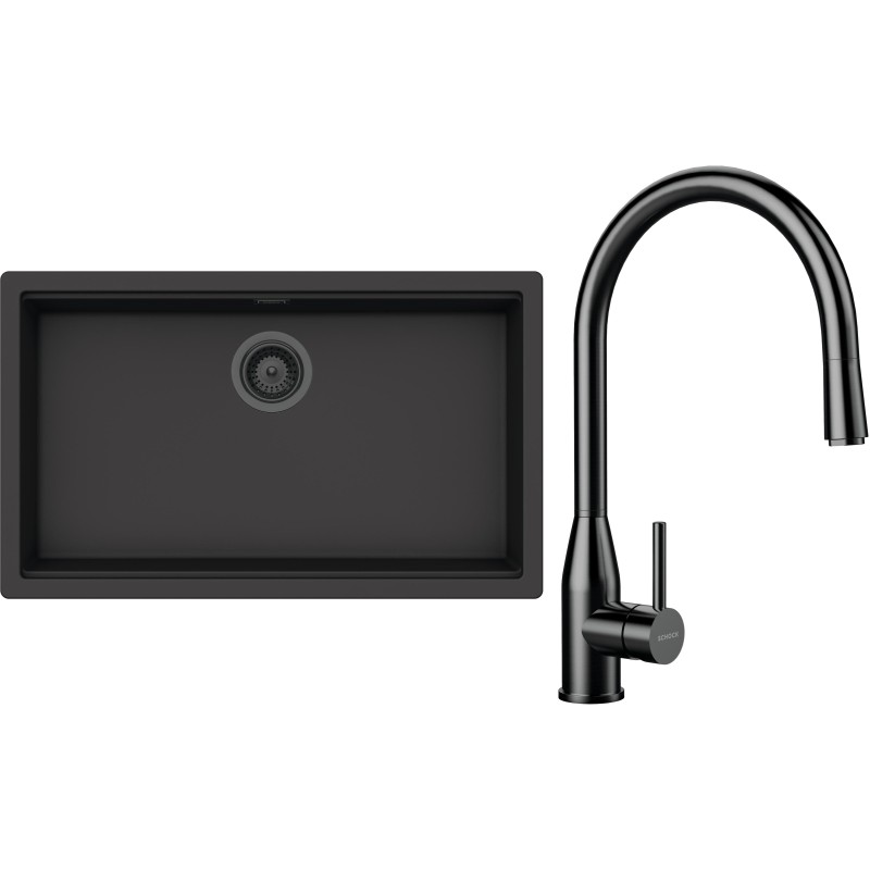Cenově zvýhodněný set dřezu a baterie Schock S33-10 - obsahuje granitový jednodřez Kiruna N-100XL Dusk, baterii s vytahovací koncovkou Kavus.120 Gunmetal brushed a části dřezu v provedení Gunmetal brushed.