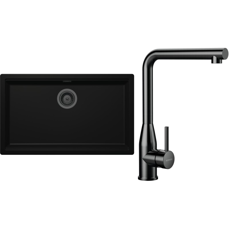 Cenově zvýhodněný set dřezu a baterie Schock S33-15 - obsahuje granitový jednodřez Kiruna N-100XL Night, baterii Keto Gunmetal brushed a části dřezu v provedení Gunmetal brushed.