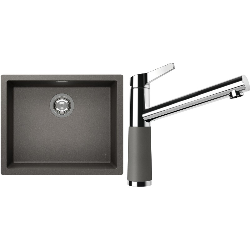 Cenově zvýhodněný set dřezu a baterie Schock S14-4 - obsahuje granitový jednodřez Kaia N-100L Silverstone a baterii SC-510 Silverstone.