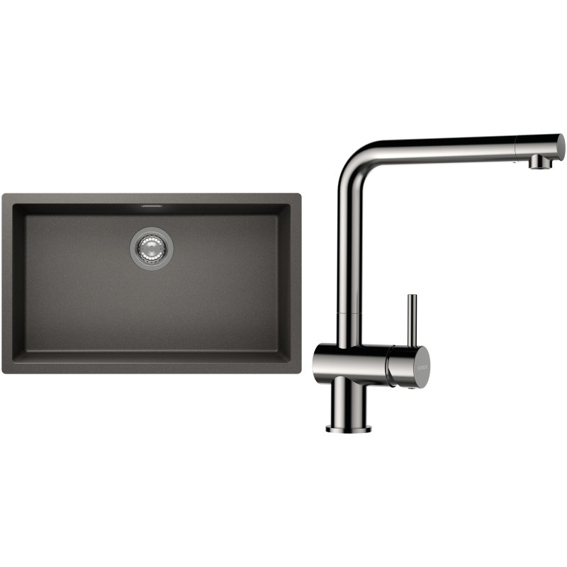 Cenově zvýhodněný set dřezu a baterie Schock S15-3 - obsahuje granitový jednodřez Kaia N-100XL Silverstone a baterii Epos Nerezový vzhled.