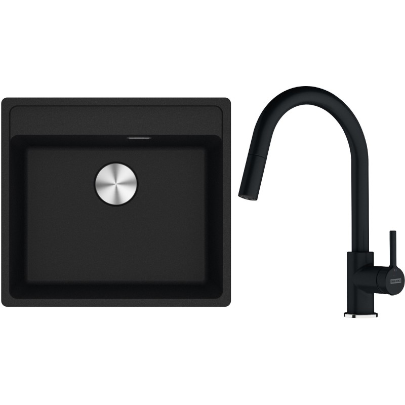 Cenově zvýhodněný set Franke G296O obsahuje granitový dřez jednodřez MRG 610-52 RTL Onyx a baterii s vytahovací koncovkou FC 6051.071 LINA Onyx.