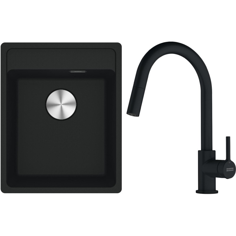 Cenově zvýhodněný set Franke G293MČ obsahuje granitový dřez jednodřez MRG 610-37 RTL Matná černá a baterii s vytahovací koncovkou FC 6051.901 LINA Matná černá.