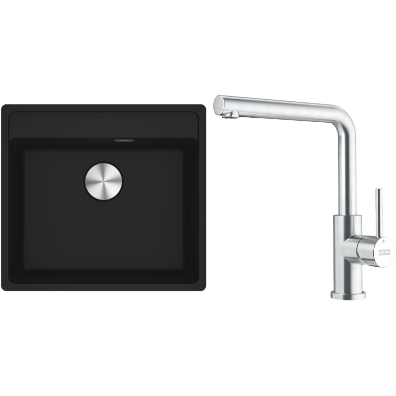 Cenově zvýhodněný set Franke G297MČ obsahuje granitový dřez jednodřez MRG 610-52 RTL Matná černá a baterii FC 6985.501 SMART GLENDA Celonerez.