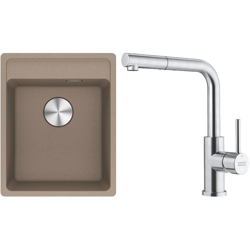 Cenově zvýhodněný set Franke G295KA obsahuje granitový dřez jednodřez MRG 610-37 RTL Kašmír a baterii s vytahovací koncovkou FC 6986.501 SMART GLENDA Celonerez.
