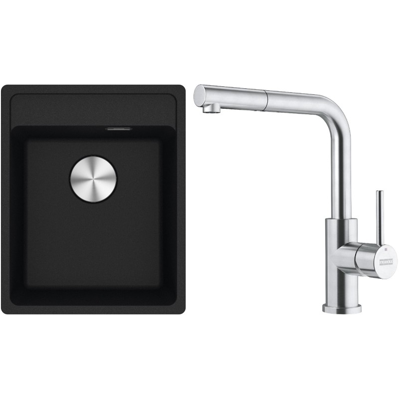 Cenově zvýhodněný set Franke G295O obsahuje granitový dřez jednodřez MRG 610-37 RTL Onyx a baterii s vytahovací koncovkou FC 6986.501 SMART GLENDA Celonerez.