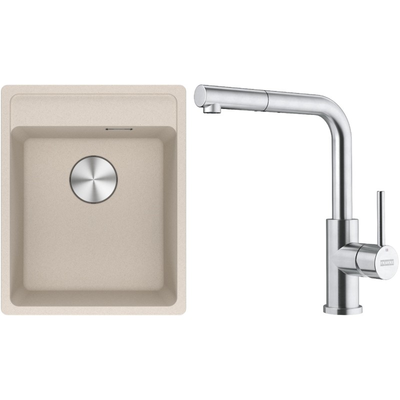 Cenově zvýhodněný set Franke G295SA obsahuje granitový dřez jednodřez MRG 610-37 RTL Sahara a baterii s vytahovací koncovkou FC 6986.501 SMART GLENDA Celonerez.