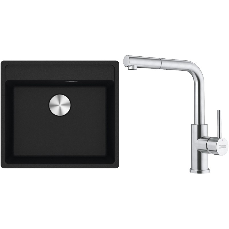 Cenově zvýhodněný set Franke G298O obsahuje granitový dřez jednodřez MRG 610-52 RTL Onyx a baterii s vytahovací koncovkou FC 6986.501 SMART GLENDA Celonerez.