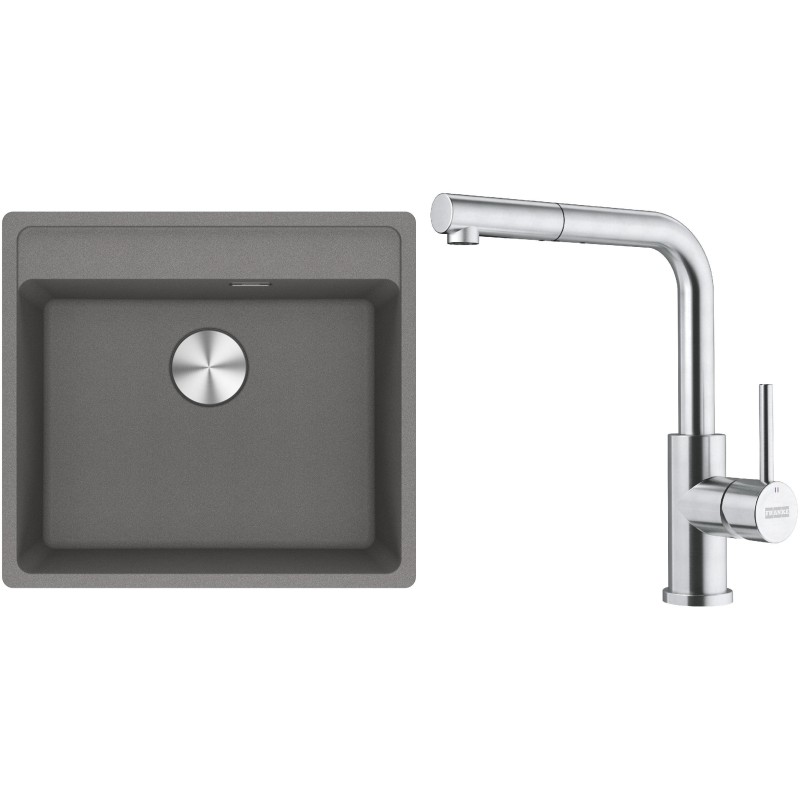 Cenově zvýhodněný set Franke G298ŠK obsahuje granitový dřez jednodřez MRG 610-52 RTL Šedý kámen a baterii s vytahovací koncovkou FC 6986.501 SMART GLENDA Celonerez.