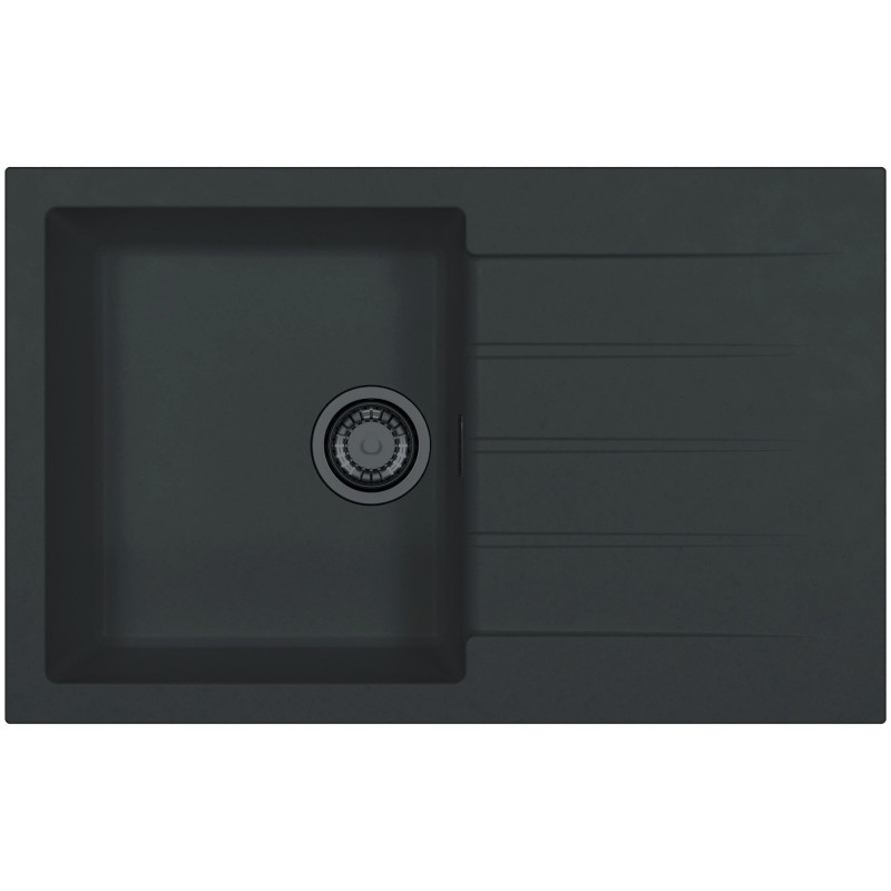 Granitový dřez s odkapem, provedení Deep Black A90 s černými komponenty, otočný, rozměr 790 x 500 mm, vana 375 x 425 x 200 mm, horní montáž, minimálně 50 cm skříňka, s excentrem, 2 otvory z výroby.