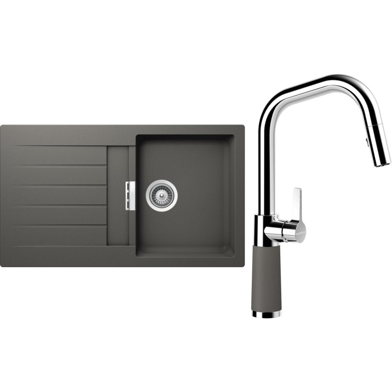 Cenově zvýhodněný set dřezu a baterie Schock S1-9 - obsahuje granitový dřez s odkapem Signus D-100 Silverstone a baterii se sprchou SC-530.120 Silverstone.