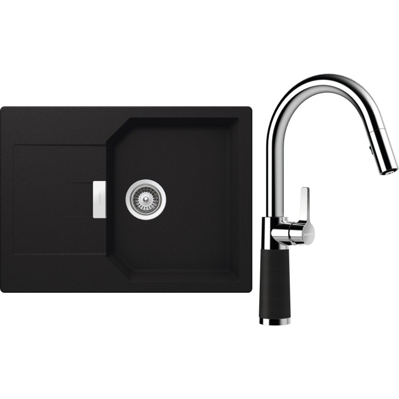 Cenově zvýhodněný set dřezu a baterie Schock S19-9 - obsahuje granitový dřez s odkapem Manhattan D-100S Onyx a baterii se sprchou SC-520.120 Onyx.