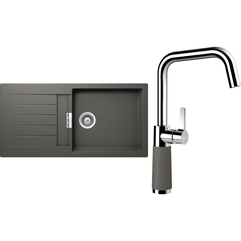 Cenově zvýhodněný set dřezu a baterie Schock S2-8 - obsahuje granitový dřez s odkapem Signus D-100L Silverstone a baterii SC-530 Silverstone.