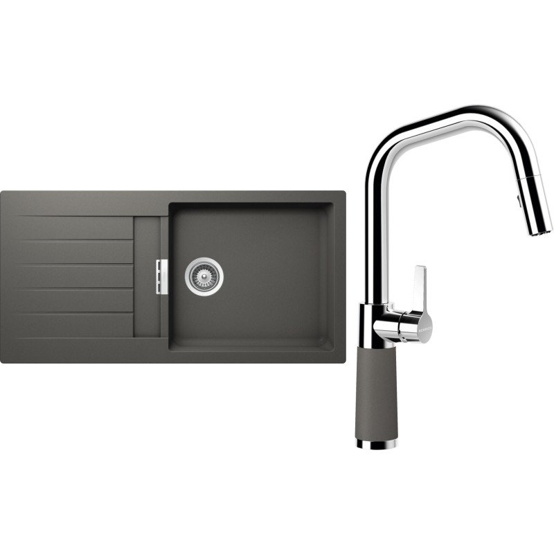 Cenově zvýhodněný set dřezu a baterie Schock S2-9 - obsahuje granitový dřez s odkapem Signus D-100L Silverstone a baterii se sprchou SC-530.120 Silverstone.