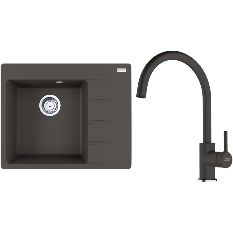 Cenově zvýhodněný set Franke G270ŠB obsahuje granitový dřez s odkapem CNG 611-62 TL/2 Šedá břidlice a baterii FC 6018.088 LINA Šedá břidlice.