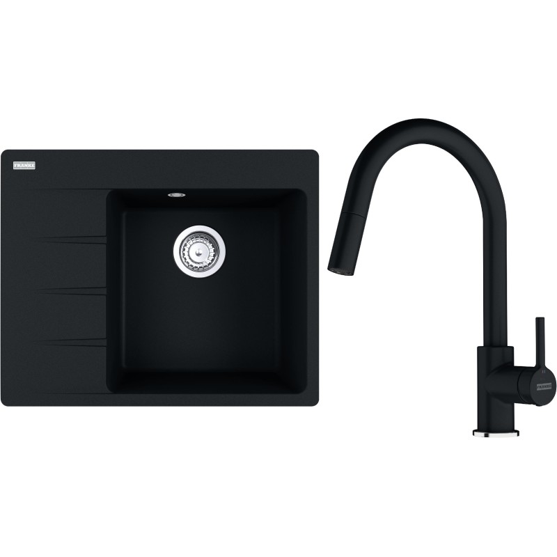 Cenově zvýhodněný set Franke G285O obsahuje granitový dřez s odkapem CNG 611-62 TL/7 Onyx a baterii s vytahovací koncovkou FC 6051.071 LINA Onyx.