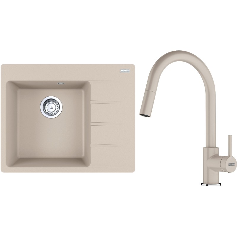 Cenově zvýhodněný set Franke G286SA obsahuje granitový dřez s odkapem CNG 611-62 TL/2 Sahara a baterii s vytahovací koncovkou FC 6051.082 LINA Sahara.