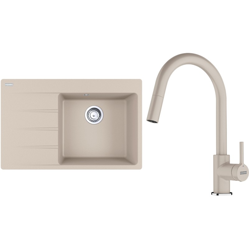 Cenově zvýhodněný set Franke G291SA obsahuje granitový dřez s odkapem CNG 611-78 TL/7 Sahara a baterii s vytahovací koncovkou FC 6051.082 LINA Sahara.