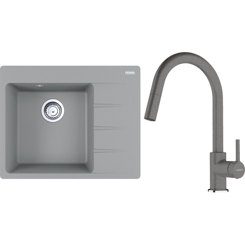 Cenově zvýhodněný set Franke G286ŠK obsahuje granitový dřez s odkapem CNG 611-62 TL/2 Šedý kámen a baterii s vytahovací koncovkou FC 6051.084 LINA Šedý kámen.