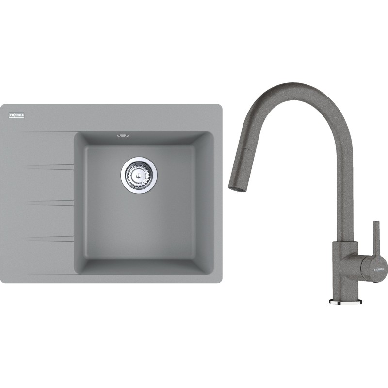 Cenově zvýhodněný set Franke G285ŠK obsahuje granitový dřez s odkapem CNG 611-62 TL/7 Šedý kámen a baterii s vytahovací koncovkou FC 6051.084 LINA Šedý kámen.