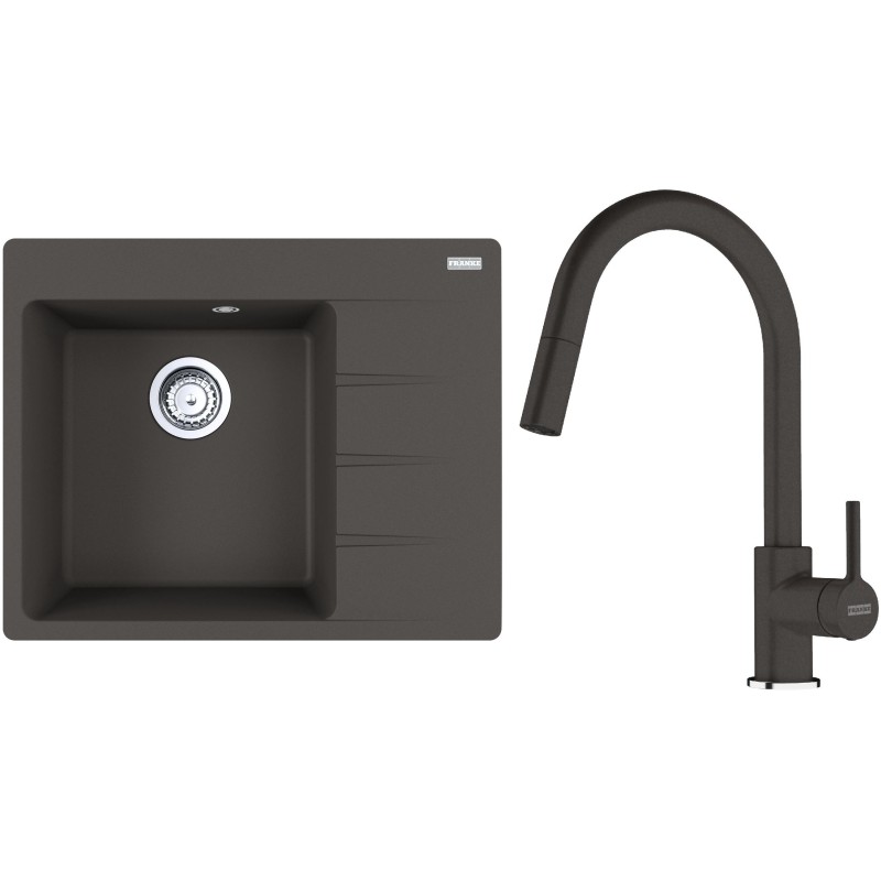 Cenově zvýhodněný set Franke G286ŠB obsahuje granitový dřez s odkapem CNG 611-62 TL/2 Šedá břidlice a baterii s vytahovací koncovkou FC 6051.088 LINA Šedá břidlice.