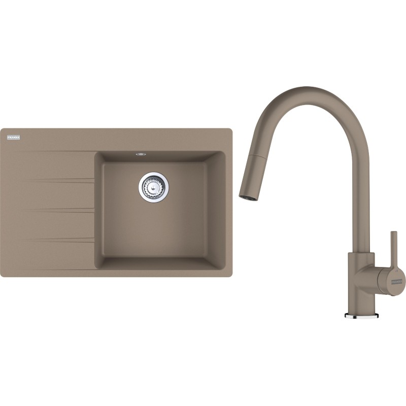 Cenově zvýhodněný set Franke G291KA obsahuje granitový dřez s odkapem CNG 611-78 TL/7 Kašmír a baterii s vytahovací koncovkou FC 6051.424 LINA Kašmír.