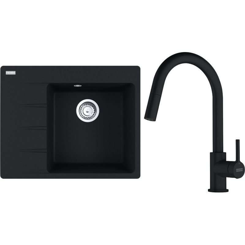 Cenově zvýhodněný set Franke G285MČ obsahuje granitový dřez s odkapem CNG 611-62 TL/7 Matná černá a baterii s vytahovací koncovkou FC 6051.901 LINA Matná černá.