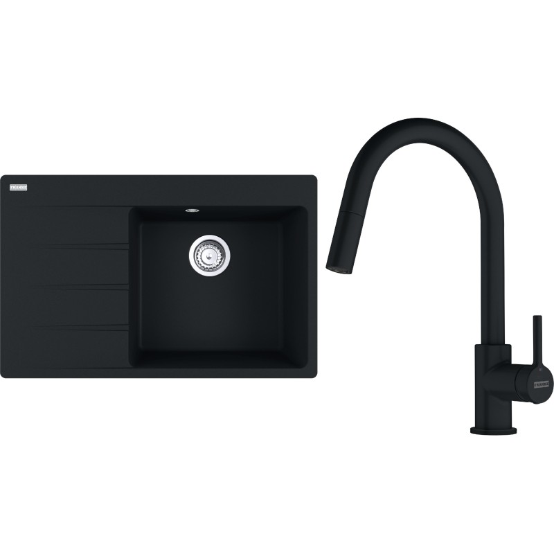 Cenově zvýhodněný set Franke G291MČ obsahuje granitový dřez s odkapem CNG 611-78 TL/7 Matná černá a baterii s vytahovací koncovkou FC 6051.901 LINA Matná černá.