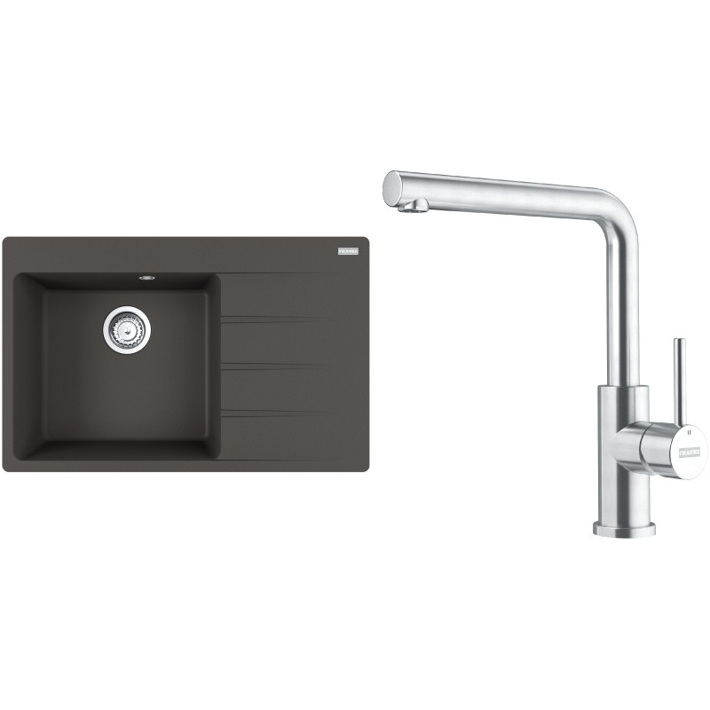Cenově zvýhodněný set Franke G288ŠB obsahuje granitový dřez s odkapem CNG 611-78 TL/2 Šedá břidlice a baterii FC 6985.501 SMART GLENDA Celonerez.