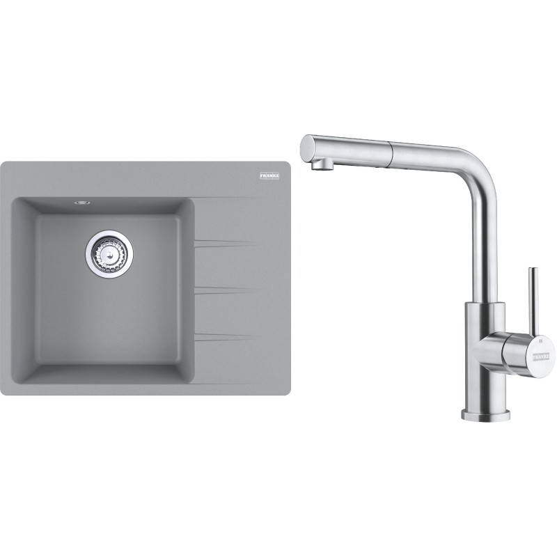 Cenově zvýhodněný set Franke G284ŠK obsahuje granitový dřez s odkapem CNG 611-62 TL/2 Šedý kámen a baterii s vytahovací koncovkou FC 6986.501 SMART GLENDA Celonerez.