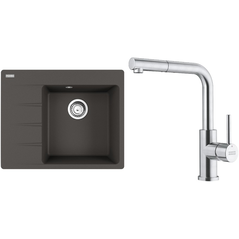 Cenově zvýhodněný set Franke G283ŠB obsahuje granitový dřez s odkapem CNG 611-62 TL/7 Šedá břidlice a baterii s vytahovací koncovkou FC 6986.501 SMART GLENDA Celonerez.
