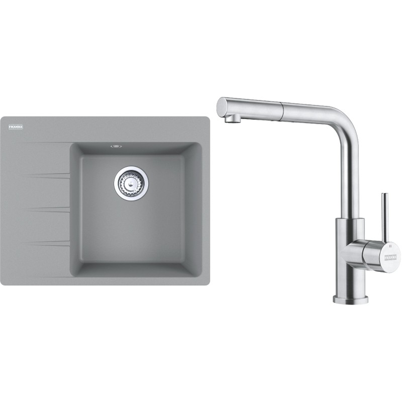 Cenově zvýhodněný set Franke G283ŠK obsahuje granitový dřez s odkapem CNG 611-62 TL/7 Šedý kámen a baterii s vytahovací koncovkou FC 6986.501 SMART GLENDA Celonerez.