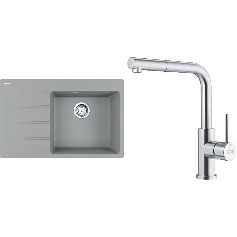 Cenově zvýhodněný set Franke G289ŠK obsahuje granitový dřez s odkapem CNG 611-78 TL/7 Šedý kámen a baterii s vytahovací koncovkou FC 6986.501 SMART GLENDA Celonerez.
