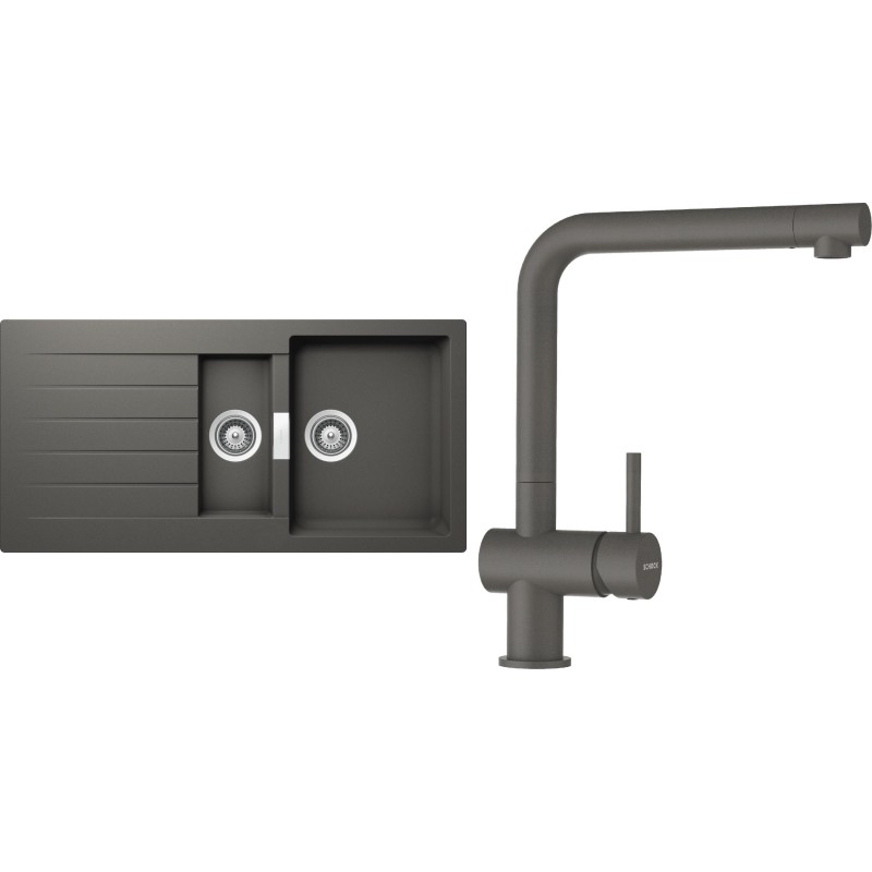 Cenově zvýhodněný set dřezu a baterie Schock S3-1 - obsahuje granitový dřez s vaničkou a odkapem Signus D-150 Silverstone a baterii Epos Silverstone.
