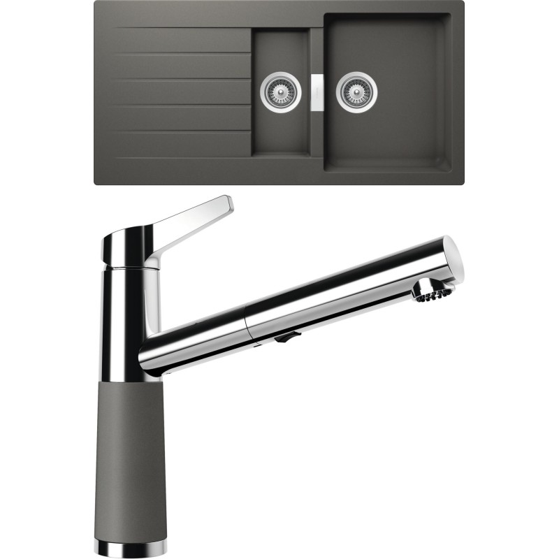 Cenově zvýhodněný set dřezu a baterie Schock S3-5 - obsahuje granitový dřez s vaničkou a odkapem Signus D-150 Silverstone a baterii se sprchou SC-510.120 Silverstone.