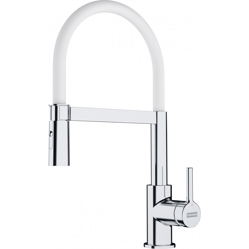 Stojánková dřezová baterie, provedení Chrom/Bílá, výška 410 mm, perlátor na pružině s přepínačem na sprchu, pro otvor 35 mm, otočná o 150 °.